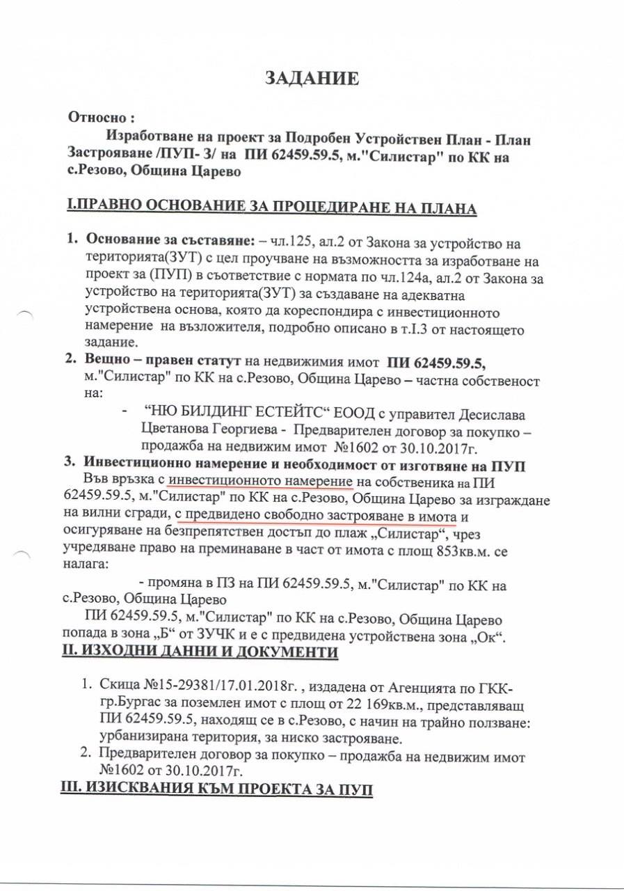 Във връзка с приложената докладна за одобряване на ПУП за вилно селище в района на Силистар, в Парк Странджа и Натура 2000, и процедурата, която е НЕЗАКОННА, настоявам да наложите ПАМ (принудителна административна мярка) по реда на чл.123 във връзка с чл.122 ал.1 т.1 от ЗБР на процедурата и да спрете решението на Общински съвет – Царево.