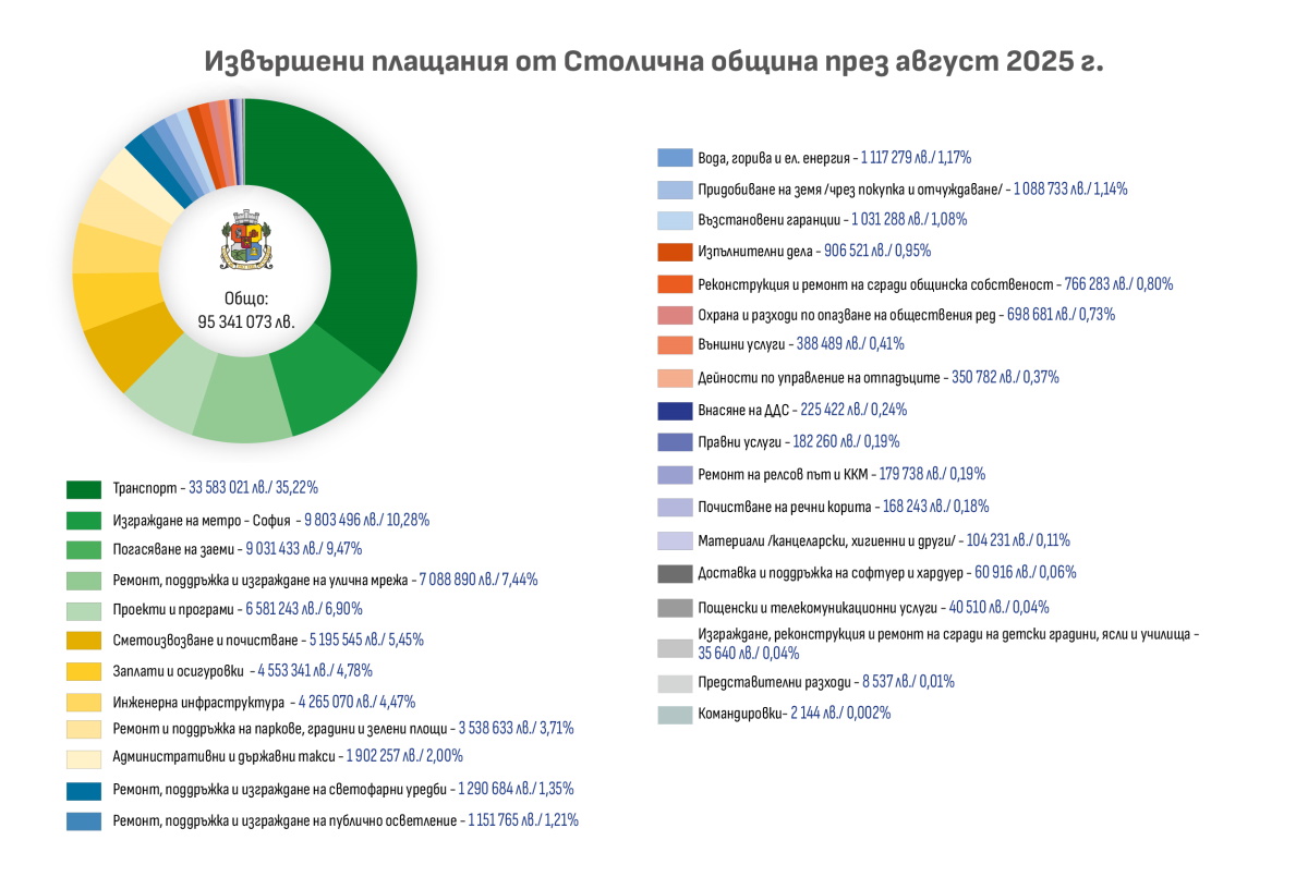 Общо разплатени от Столичната община средства през месеца са – 246 591 432 лв. От тях извършените плащания директно от общината са в размер на 95 341 073 лв., което е 38.66 % от общите разплащания за месеца.