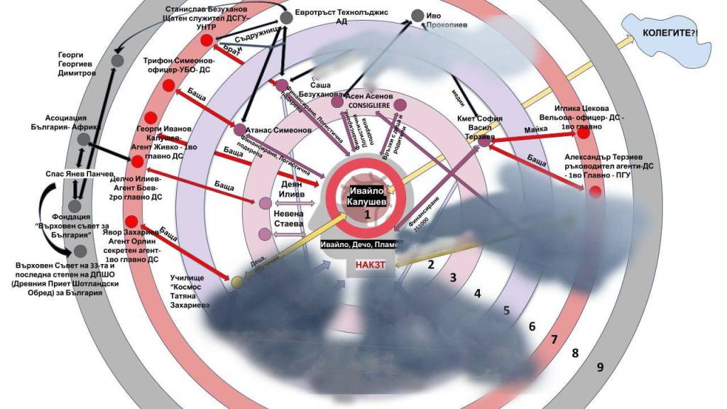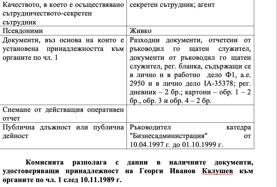Първата и най-очевидна линия започва от самото ядро. Бащата на Ивайло Калушев. Георги Калушев е разкрит като високопоставен секретен сътрудник към Първо главно управление на ДС, работил под псевдонима „Живко“. Вербуван е през 1972 г., когато е бил на 28 г., преминал през разузнаването и контраразузнаването, той не изчезва след 1989 г., а продължава кариерата си в академичната среда, включително като ръководител на катедра в УНСС. По наличните документите от Комисията по досиетата става ясно, че Калушев е продължил секретната си служба и след 10 ноември 1989 г. вече в структурите на институцията наследила комунистическата Държавна сигурност, а именно Националната служба за сигурност /НСС/, която впоследствие стана ДАНС. Той е разкрит като служител и преподавател в УНСС, едва през 2014 г.. Това е един от типичните преходи на кадрите на ДС-от оперативни структури към институционална легитимност