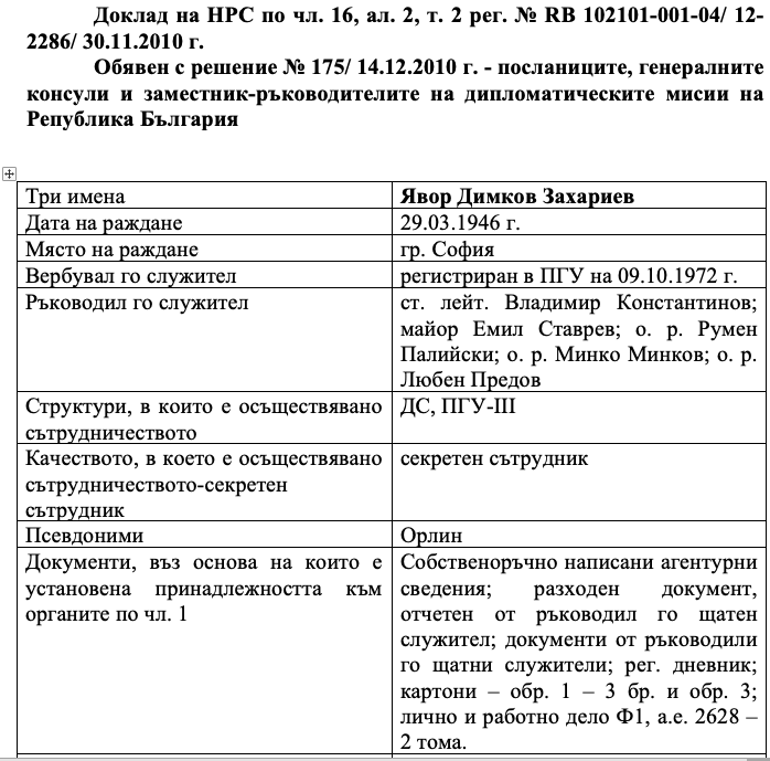 Точно тук се появяват и най-интересните пресечни точки. „Орлин“ и „Боев“ са разкрити в едно и също решение на Комисията по досиетата — Решение № 199 от 16 март 2011 г., Това подчертава, че двамата са били колеги в Министерството на външните работи дълги години. Агент „Орлин“ е заемал висши дипломатически мисии в чужбина до 2010 г., а агент „Боев“ е останал да работи и в системата след 1989 г. Това е качествено различно от простото изброяване на три агентурни псевдонима. Тук вече се вижда вътрешна свързаност. Двама от тези хора не само произлизат от една и съща служебна вселена, но и имат общо професионално поле, обща институция и общ времеви хоризонт. Когато към тази ос се добави и агент „Живко“, излязъл като преподавател и ръководител на катедра в УНСС, се очертава триъгълник между дипломатическия корпус, академичната среда и семейното ядро на групата.